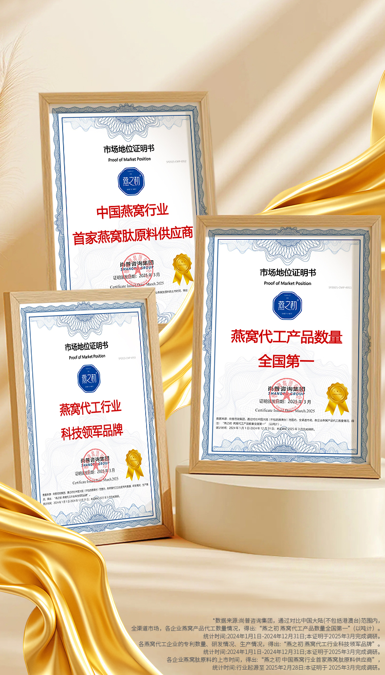 *1数据来源:尚普咨询集团,通过对比中国大陆(不包括港澳台)范围内,各燕窝代工企业的专利数量、研发情况、生产情况,得出:“燕之初 燕窝代工行业科技领军品牌”。统计时间:2024年1月1日-2024年12月31日;本证明于2025年3月完成调研。