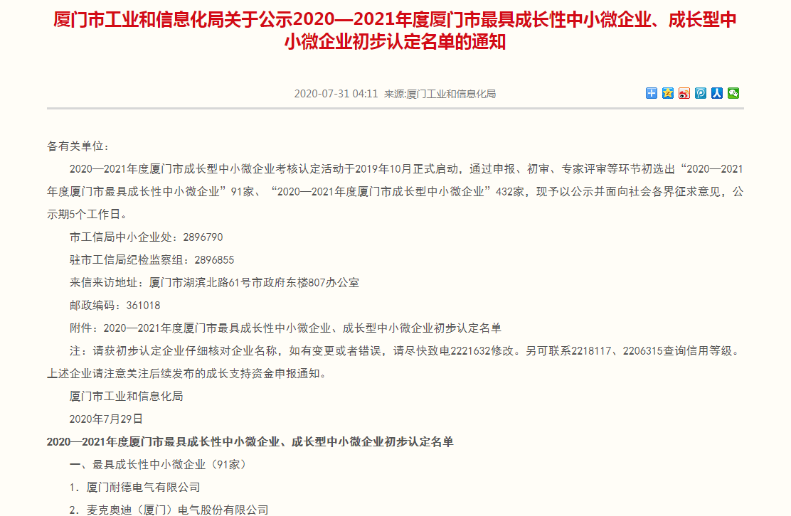 由厦门市工业和信息化局主办的2020-2021年度厦门市成长型中小微企业考核认定活动,于2019年10月正式启动,共选出“2020—2021年度厦门市最具成长性中小微企业”91家、“2020—2021年度厦门市成长型中小微企业”432家。